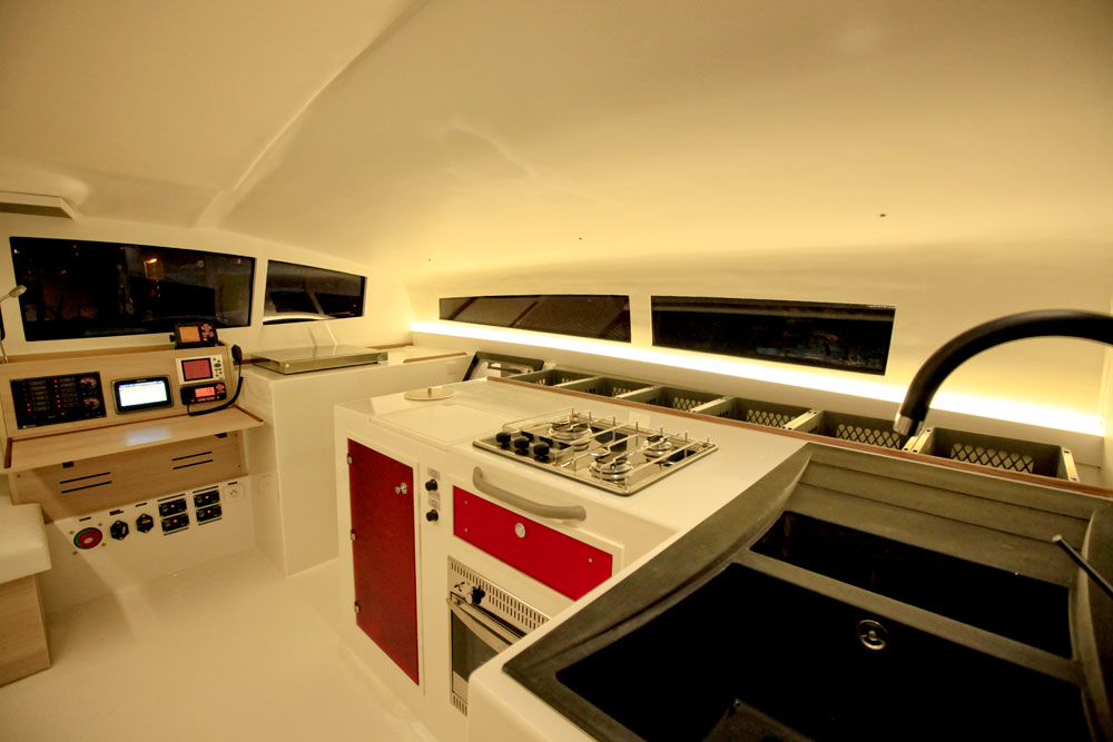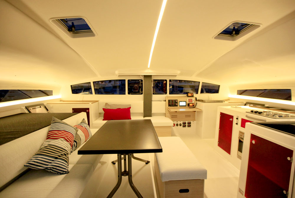 Un cataraman de croisière rapide, entièrement conçu pour allier la performance au confort de la navigation à deux coques. Tout comme le Pogo chez les monocoques, l'ensemble est sobre et efficace, poru un programme qui devrait ravir les amateurs de glisse!